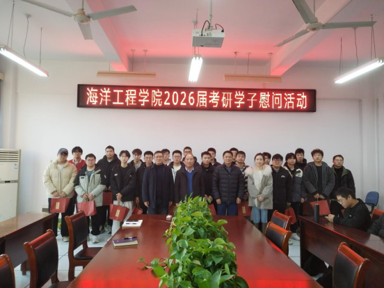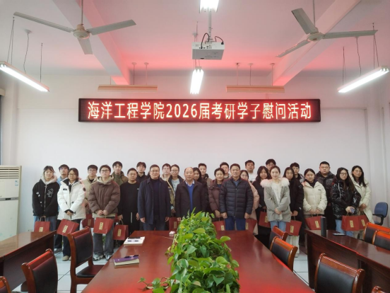 为切实做好考研学生服务保障工作,缓解学生备考压力,鼓舞冲刺士气。12月15日下午,海洋工程学院在机械南楼309会议室开展2026届考研学子慰问活动。学院党总支书记唐正康、院长缪泉明、副书记王海、学工办主任朱甜甜及全体2026届考研学子参加了本次活动,活动由王海主持。